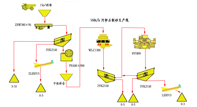 阆中地区的河卵石(云母含量低)资源丰富,这样的石料非常适合于制造机制砂,为此,我公司为该客户设计了一整套破碎筛分系统用于生产机制砂,使浪费在河道里的卵石资源变废为宝,为客户创造了巨大的利益。